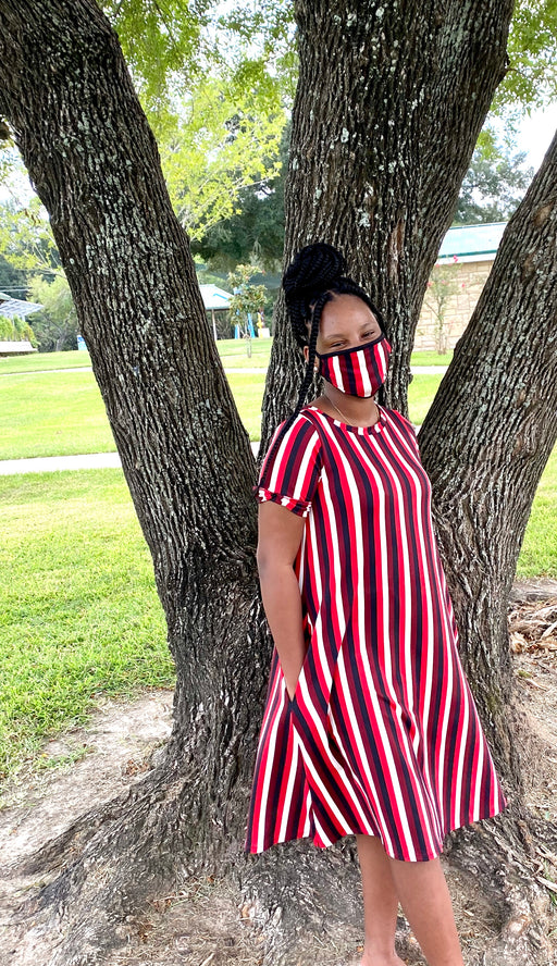 Cherry Praise Red & Black Vertical Stripe A-Line Dress with Matching Face Mask – Women’s Short Sleeve Pocket Dress $8.99